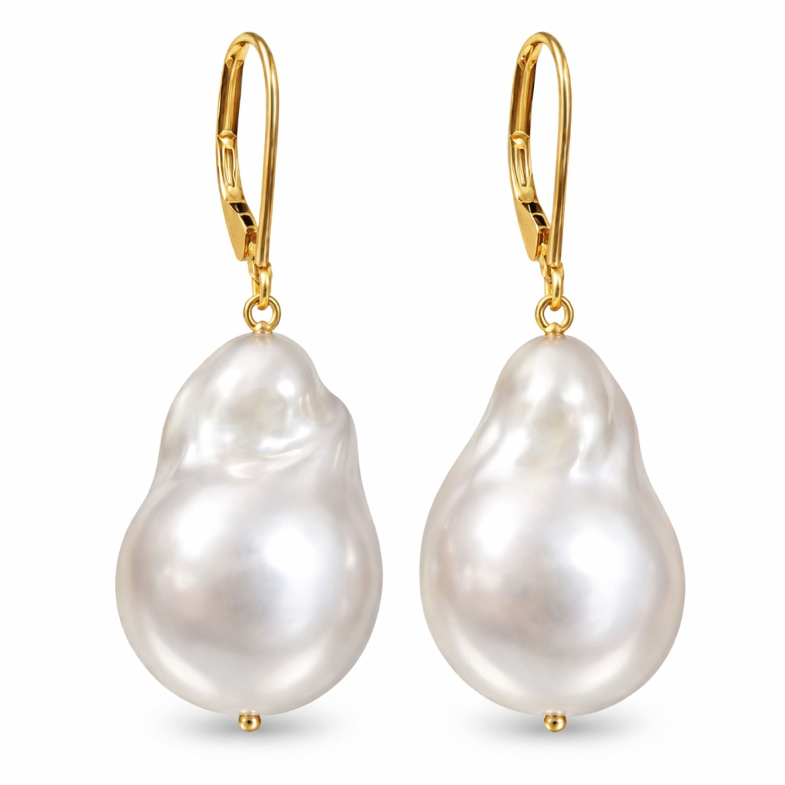 Naušnice s kopčom tipa leverback od 14K žutog zlata, s velikim prirodnim bijelim Baroque Edison biserima. Komad nakita s biserom i zlatom koji spaja klasičnu eleganciju s originalnošću organskog oblika.