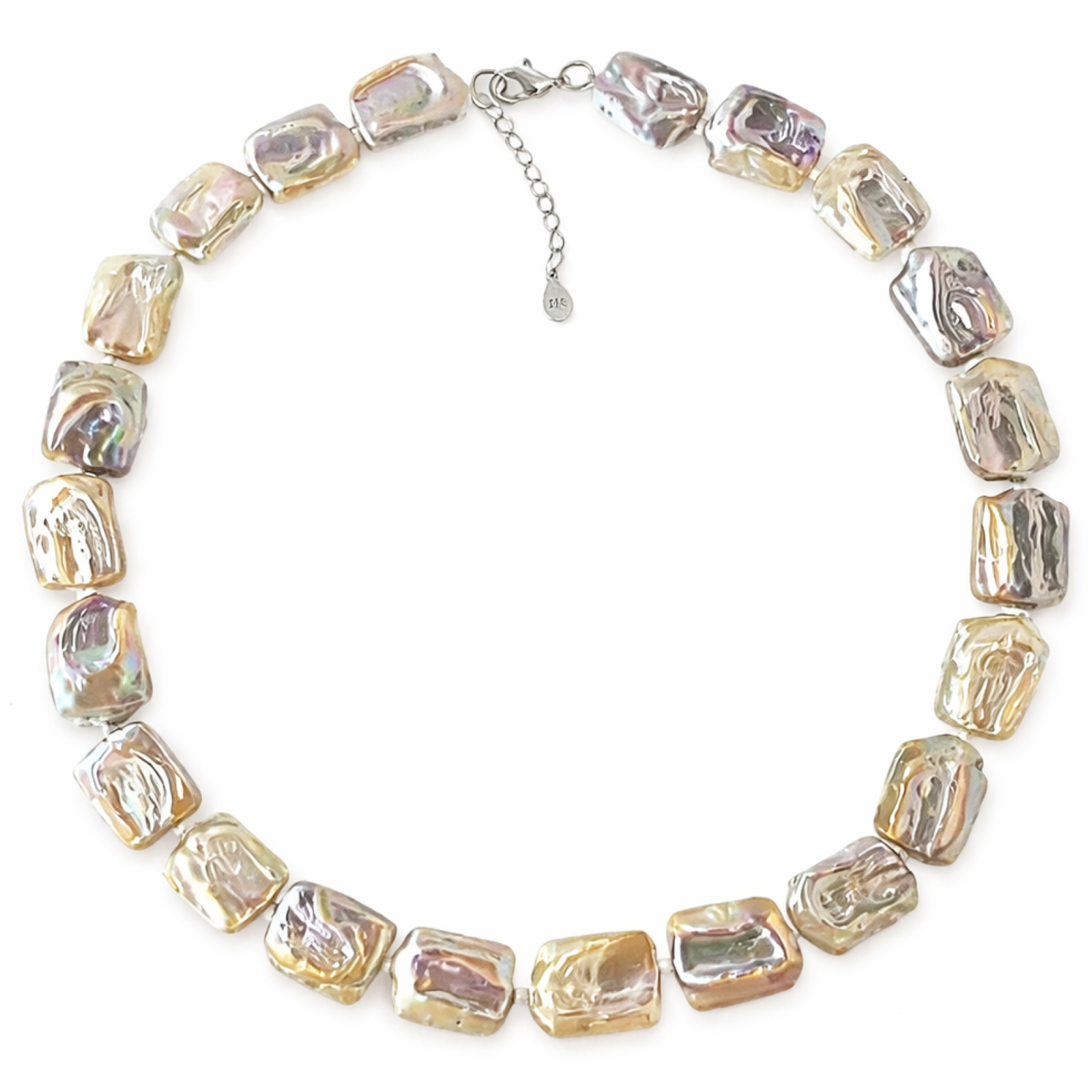 Ogrlica je izdelana iz naravnih, večbarvnih baročnih biserov, ročno vozlanih na svili s sponko iz srebra 925, prevlečenega s platino/belim rodijem. Velikost baročnih biserov je približno 15x20 mm. Dolžina ogrlice je 43 cm + podaljšana verižica dolžine 3 cm iz srebra 925, prevlečenega s platino/belim rodijem.