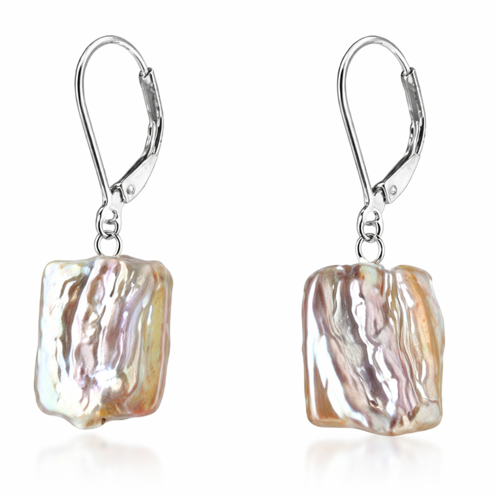 Uhani imajo zaprto kljuko, izdelano iz srebra 925, prevlečenega s platino/belim rodijem, ter naravne večbarvne baročne bisere, ki merijo približno 15x20 mm.