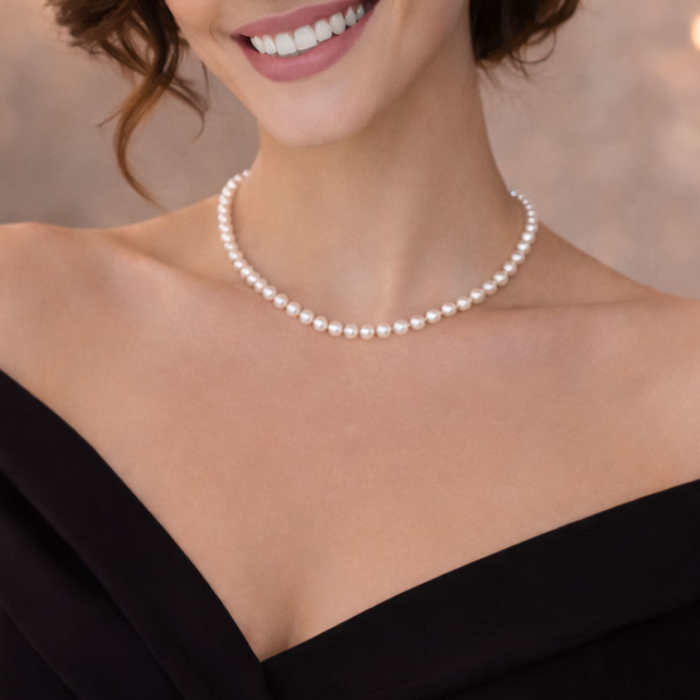 Ogrlica, ki se nosi ob vratu, izdelana iz redkih naravnih biserov velikosti 4–5 mm, okroglih in nežnih, kakovosti AAA z odličnim sijajem. Elegantno nanizana na naravno svilo in zaključena z elementi iz srebra 925, doda vsaki opravi čisto noto prefinjenosti. Navdihujoča izbira za ženske, ki cenijo diskreten, a izrazit nakit – edinstveno darilo.