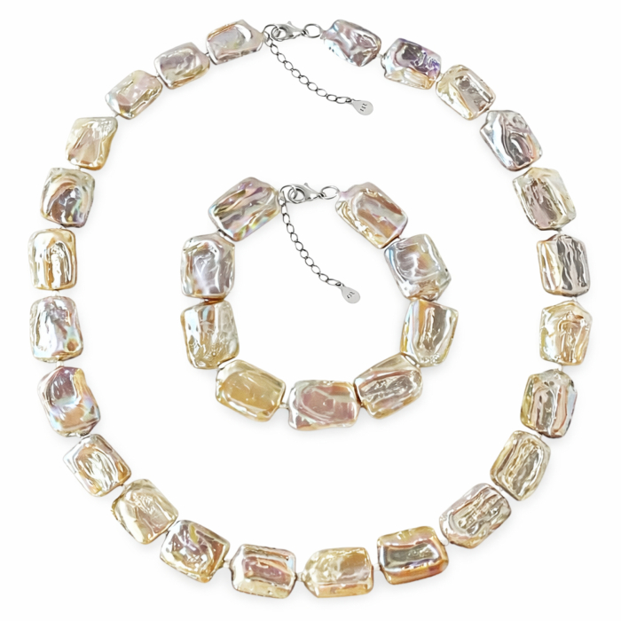 Náramok je vyrobený z prírodných, viacfarebných barokových perál, ručne uzlovaných na hodvábe so sponou zo striebra 925, pokovenou platinou/bielym ródium. Veľkosť barokových perál je približne 15x20 mm. Dĺžka náramku je 18-19 cm + 3 cm predlžovacia reťaz, vyrobená zo striebra 925 pokoveného platinou/bielym ródium.