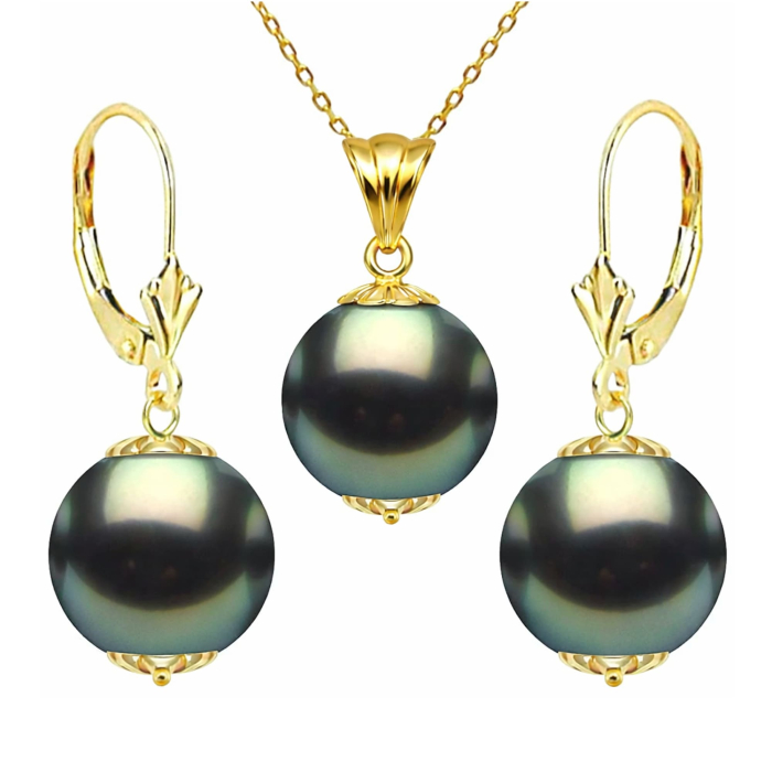Súprava tahitských perál – náhrdelník s príveskom a náušnice, žlté zlato 14K, okrúhle perly 10 mm, kvalita AAA | KASKADDA®