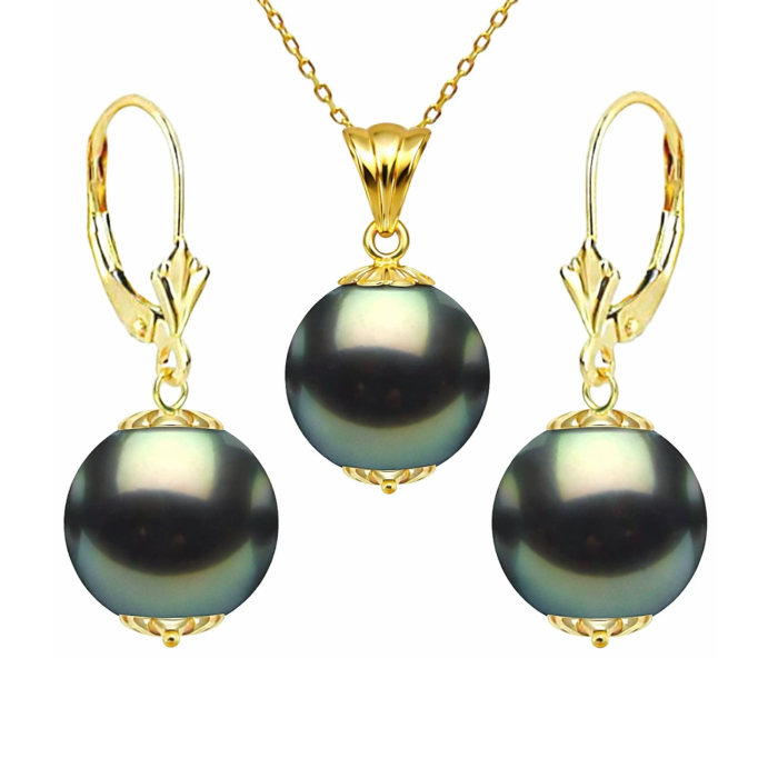Tahiti gyöngy szett – Medálos nyaklánc és fülbevaló, 14K sárga arany, természetes gyöngyök 9 mm, AAA minőség | KASKADDA®